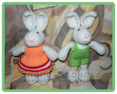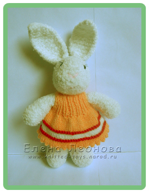 Продолжаем вязать только на двух спицах (перед и зад) резинкой 1х1 12 рядов. Закрыть петли. Закончить аналогично на вторых двух спицах. Подогнуть низ платья по линии отверстий (получатся зубчики) и пришить. Заправить кончики нитей. Надеть на зайку и сшить плечевые швы. Можно вышить цветочки по белой полосе на юбочке.