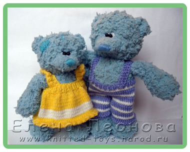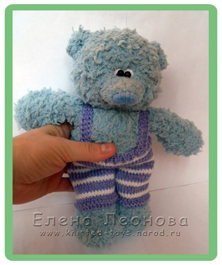 Материалы: пряжа «Плюш» голубого цвета, акрил голубого цвета, спицы №4,5 и 2,5, цветной акрил для одежды, бусины для глаз, наполнитель, игла с широким ушком.