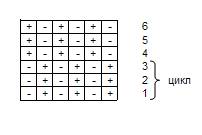 Далее по рисунку связать 4 цикла, прибавить с обеих сторон по 1 петле и связать еще 3 цикла, убавить для проймы по 2 петли с обоих краев и связать еще 2 цикла *