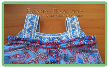 Важно! По низу лента пришивается в край ткани сарафана, а по верху – нижний край ленты пришивается в край ткани сарафана, чтобы лента выходила за сарафан. Таким образом мы получаем продолжение сарафана в виде кокетки. В конце пришиваем бретели – 10 см плюс на подгибку краев (края загибаем вовнутрь, чтобы их не было видно.