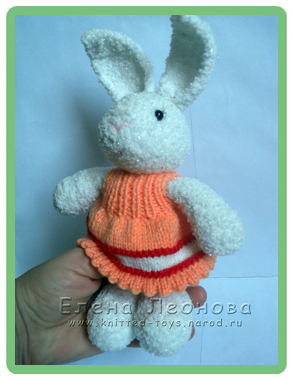 Продолжаем вязать только на двух спицах (перед и зад) резинкой 1х1 12 рядов. Закрыть петли. Закончить аналогично на вторых двух спицах. Подогнуть низ платья по линии отверстий (получатся зубчики) и пришить. Заправить кончики нитей. Надеть на зайку и сшить плечевые швы. Можно вышить цветочки по белой полосе на юбочке.